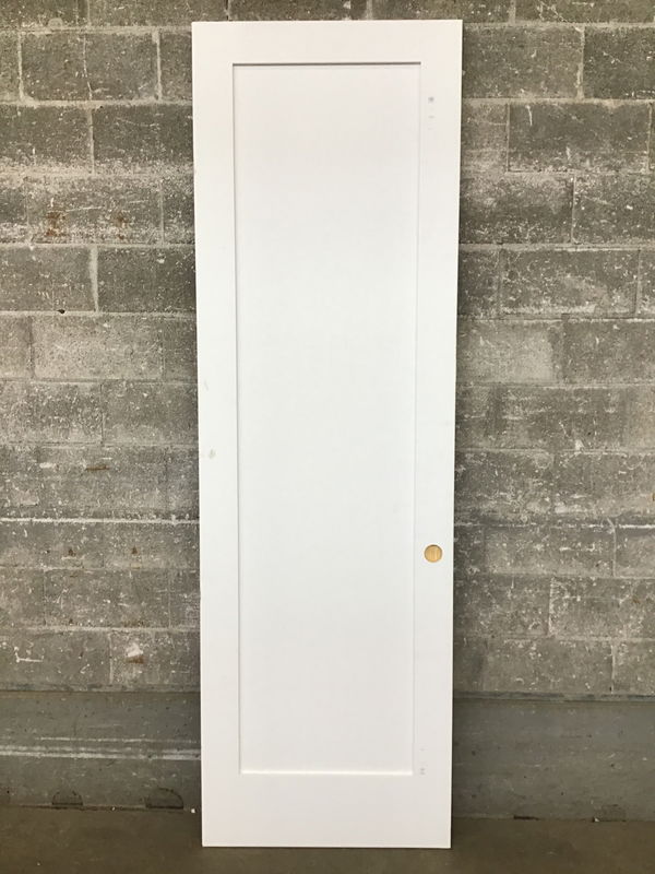 Primed masonite Shaker style one panel door. Has no hinge cuts, but partial bore for bypass door insert handle at 2 3/8" backset, which could be completed for a normal lockset.