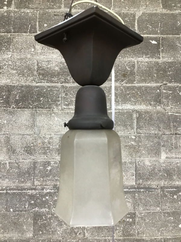 Older Rejuvenation ceiling mount light fixture with antiqued brass fitter and frosted, faceted shade. Wiring looks healthy and mounting bracket is included.