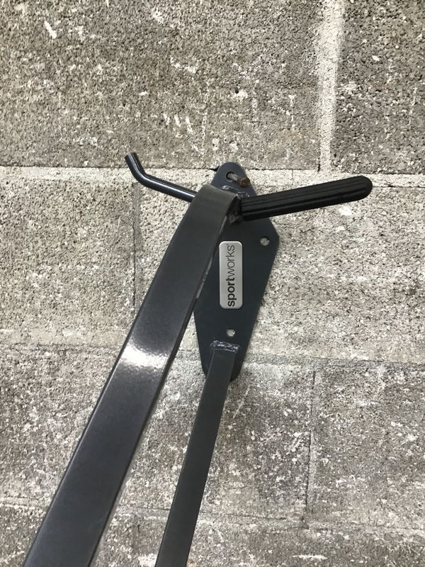 Wall mount bike rack with a padded hook for your bike on one side and a smaller hook on the other for your helmet by SportWorks. Grab one or grab a couple and get those bikes taking up floor space in your garage up on the wall!! This is a bulk item, no holds please.