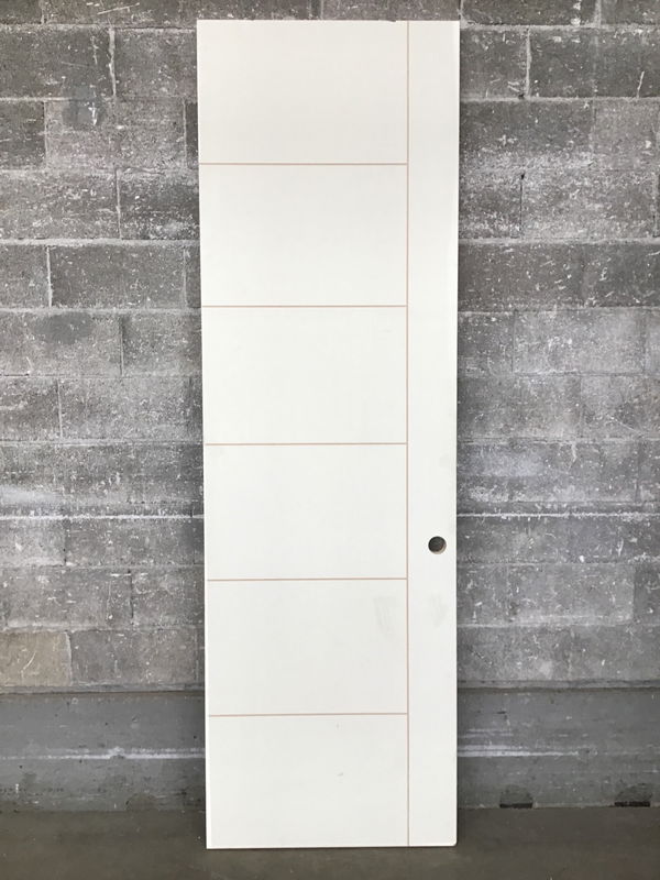 Large and in charge solid core interior door with a modern groove design on both sides. This is exterior thickness but should not be exposed to the elements. Brand new.
