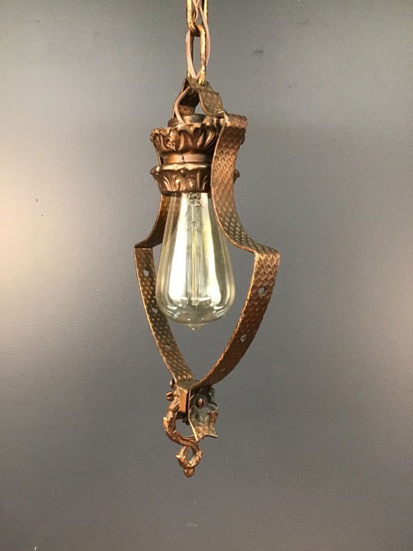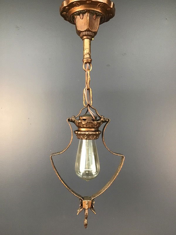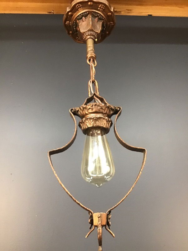 A beautiful 1920s Tudor Revival/Craftsman pendant light in a copper and polychrome finish. Restored in our on site light repair workshop
