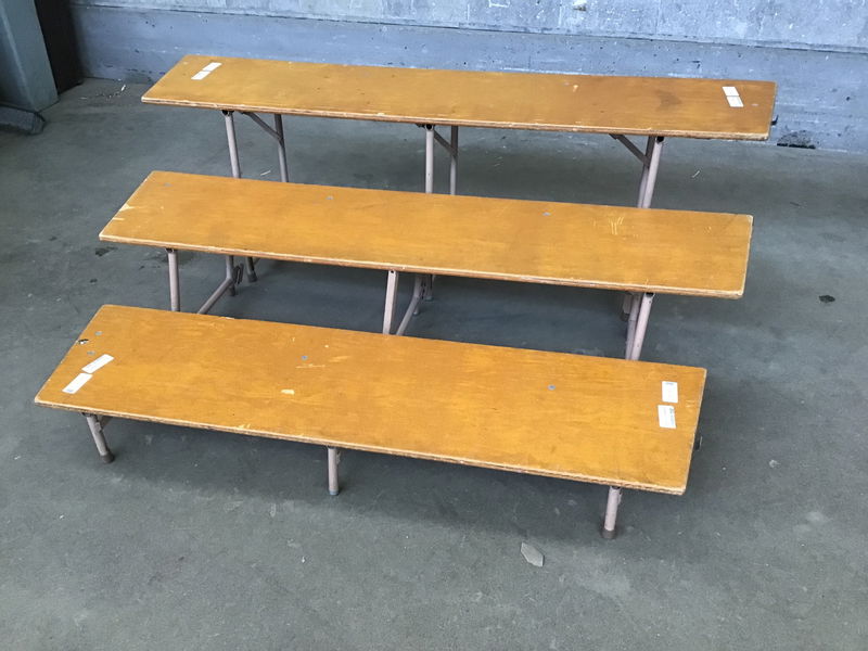 A set of stage risers in the form of three steps, with each step being 16", tapering towards the lowest step. This unit has had the tallest riser separated from it, but it is still included, price reflects condition.