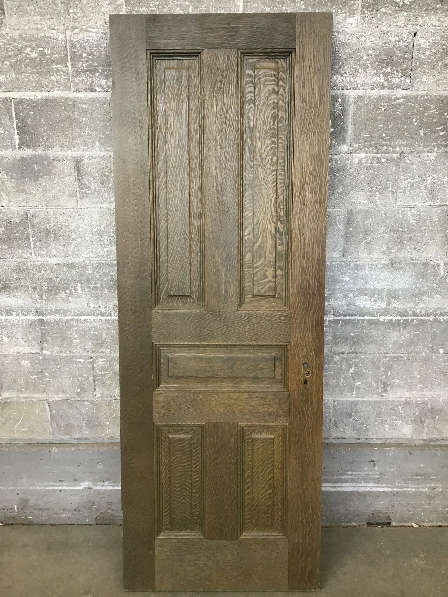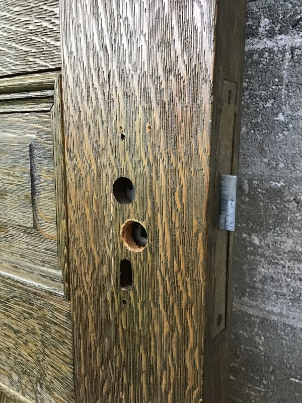 Dark stained oak door with an interesting raised panel configuration and dramatic tiger striping mixed in. This is bored for vintage hardware and comes with a cool hammered mortise. It was previously used as an interior door but is thick enough to be used as an exterior door. It's showing some minor wear and tear, but overall this is quite a stunning door.