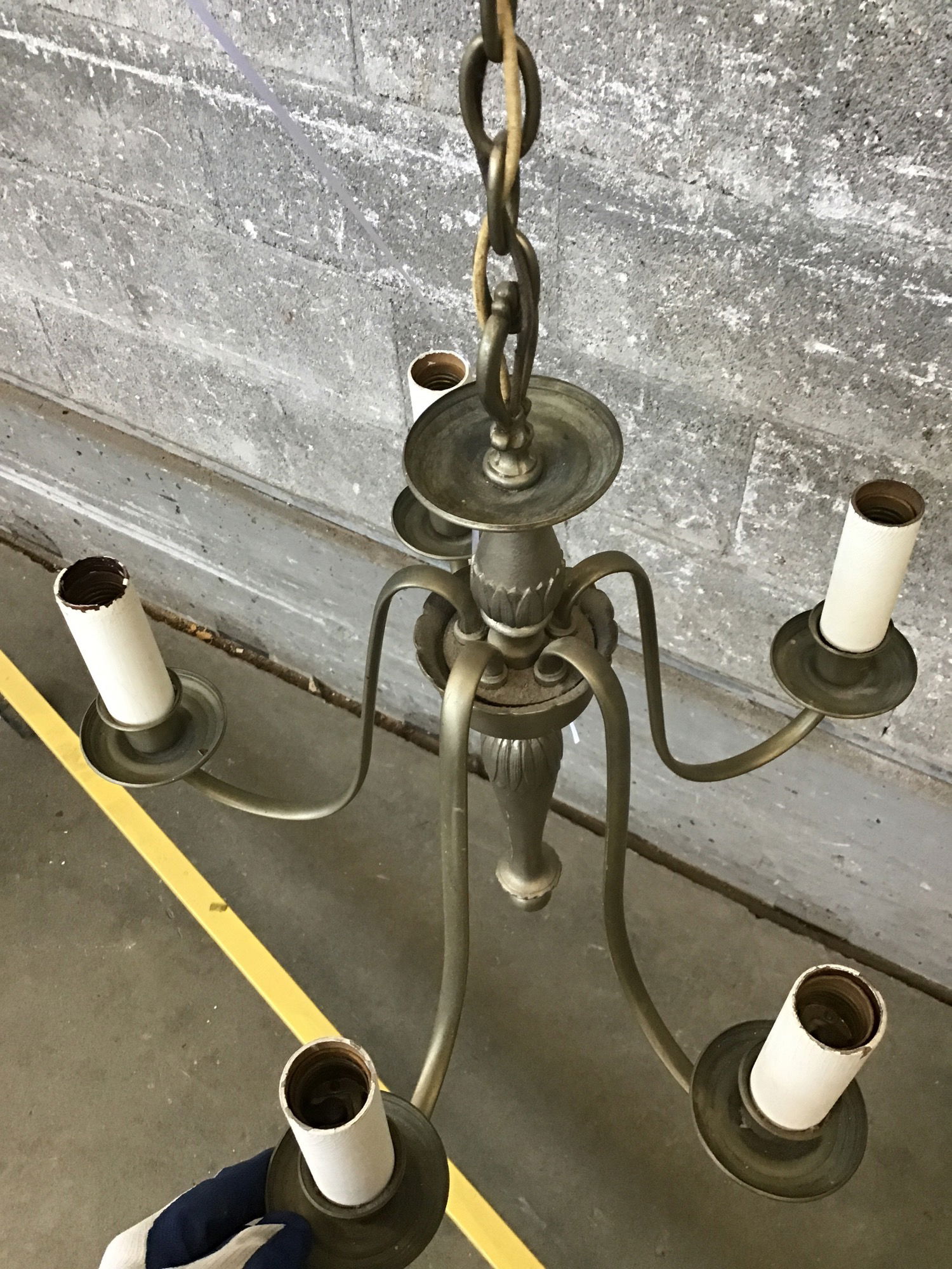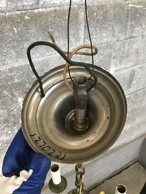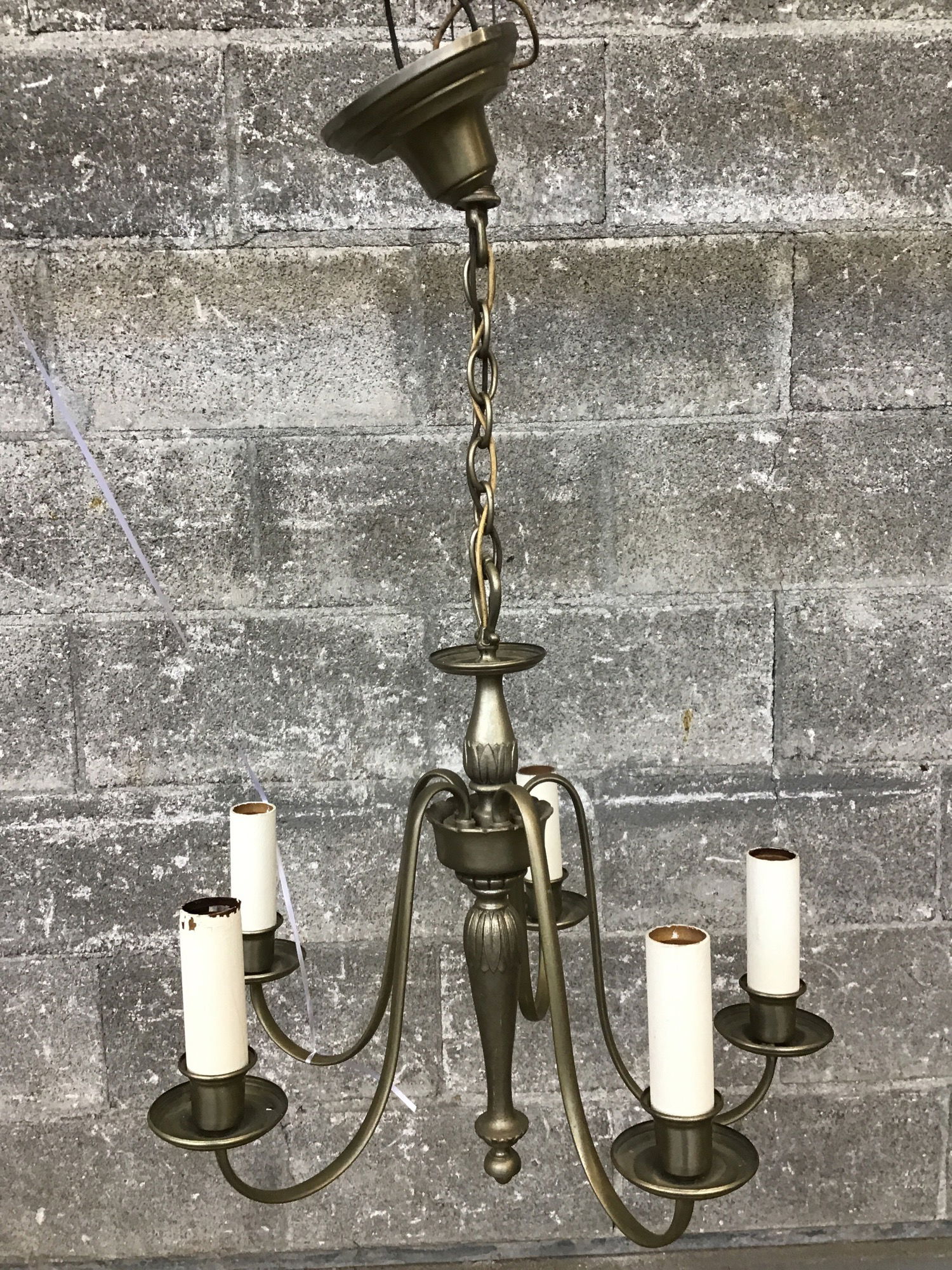 Rather delicate looking vintage chandelier featuring a warm nickel finish, five candelabra arms & an elegant tapered stem. This may need to be rewired and will definitely need a new mounting bracket, priced accordingly. If you’d like to get this light fixture rewired here at Second Use, please check out our in-house Lighting Services.