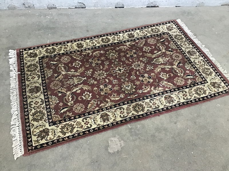 Small red toned area rug in decent shape, has one small quarter sized bald patch and needs a deep clean, otherwise in good shape.