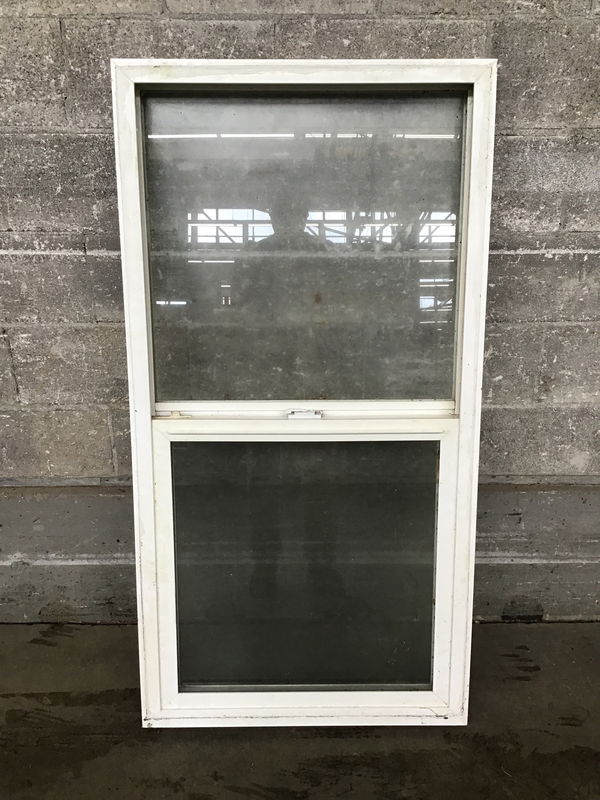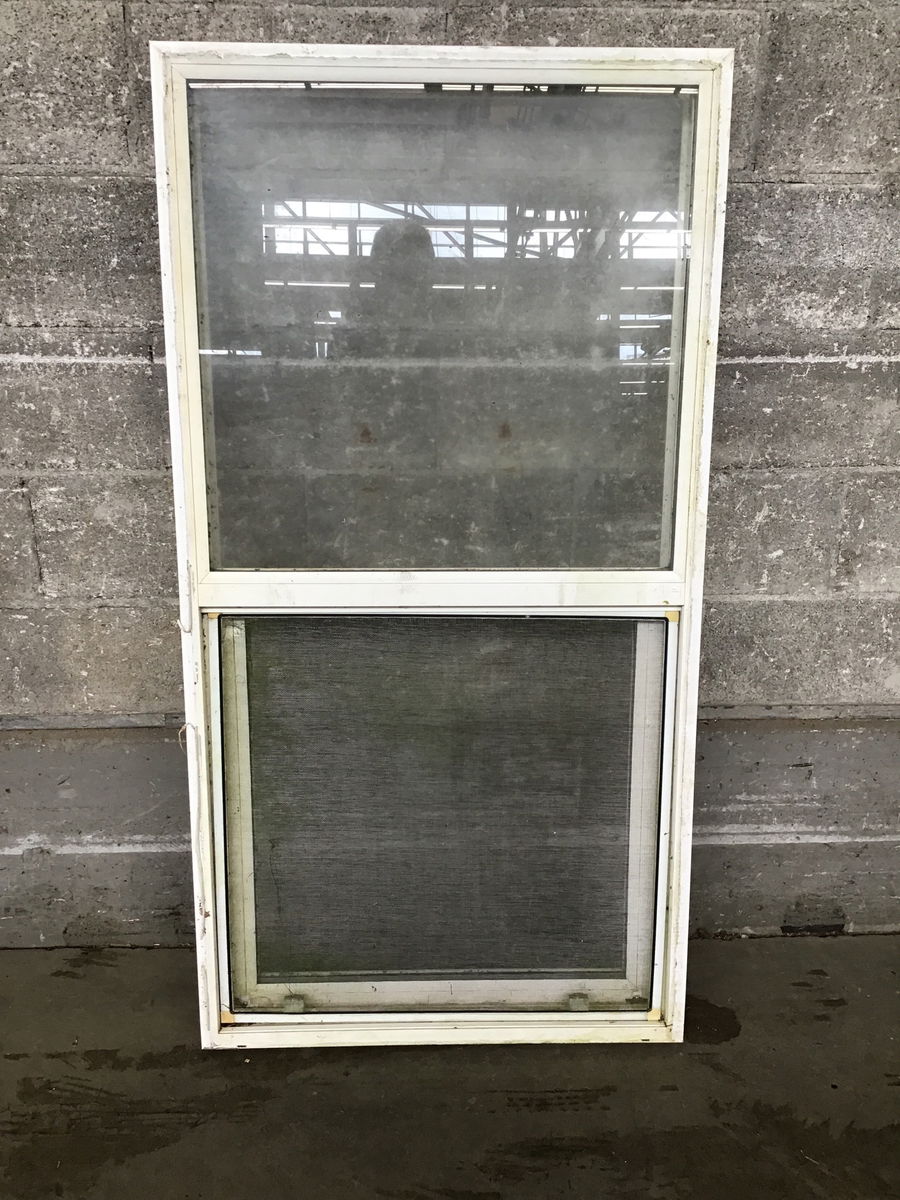 Salvaged white vinyl window that looks like it sat outside for a while after uninstall. Price reflects condition.