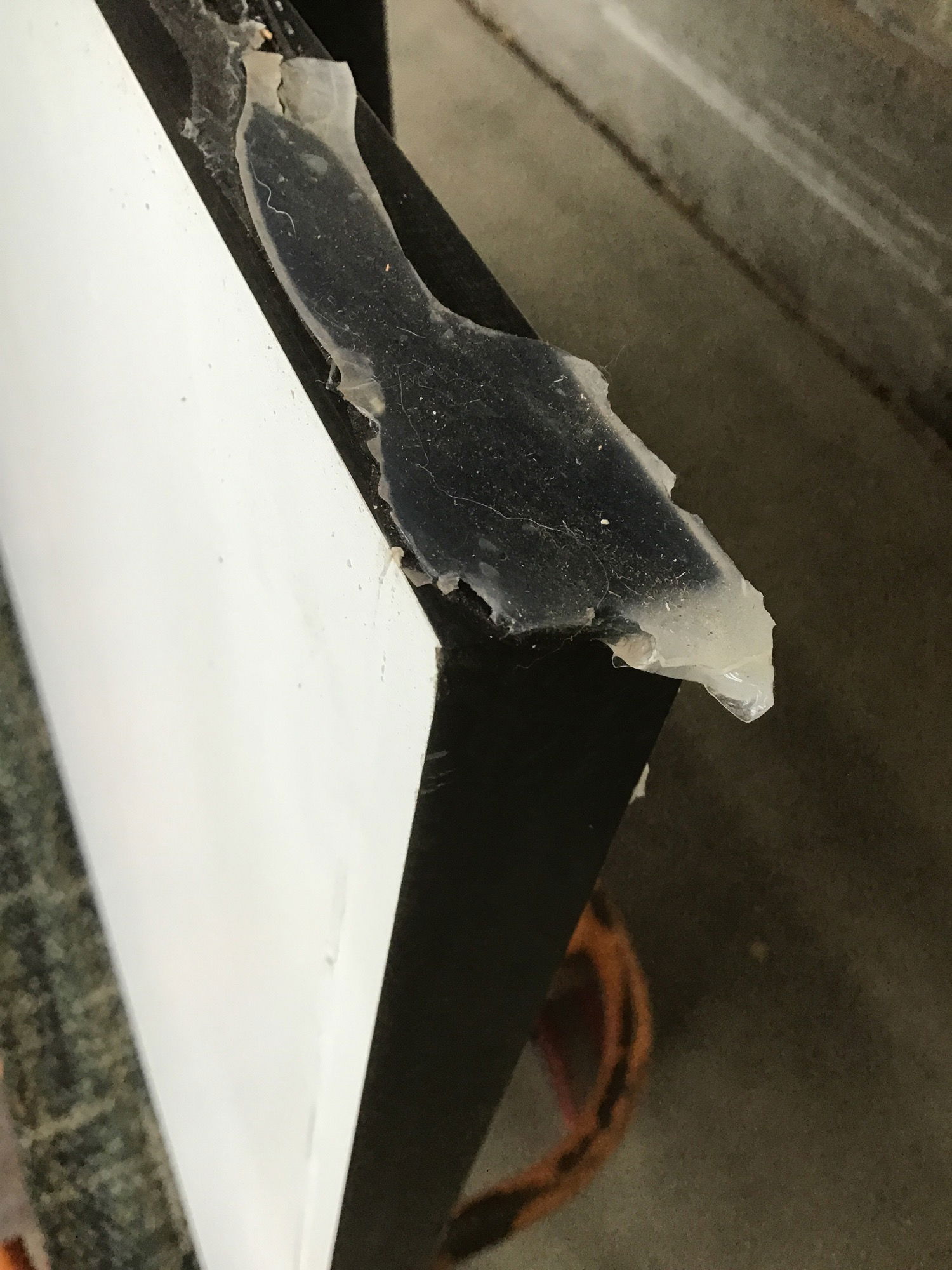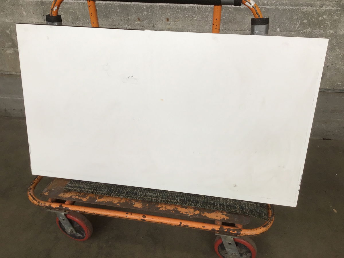 Very heavy and indestructible slab of composite countertop with white laminate top. This countertop would be ideal as a shop layout table. Beware this slab is HEAVY and will require many hands to move.