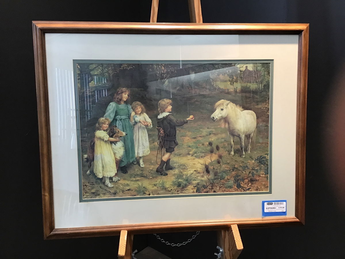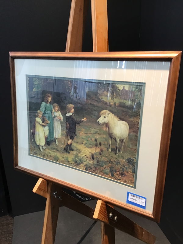 Beautifully framed print of "A Tempting Bait" by Arthur J. Elsley. Painted in 1908, it depicts a family outside with a little ragamuffin tempting a chubby little horse with a delicious apple. Large print in a really great wood frame with a thin green border around the print itself. Frame is in excellent shape and is fairly good quality wood.