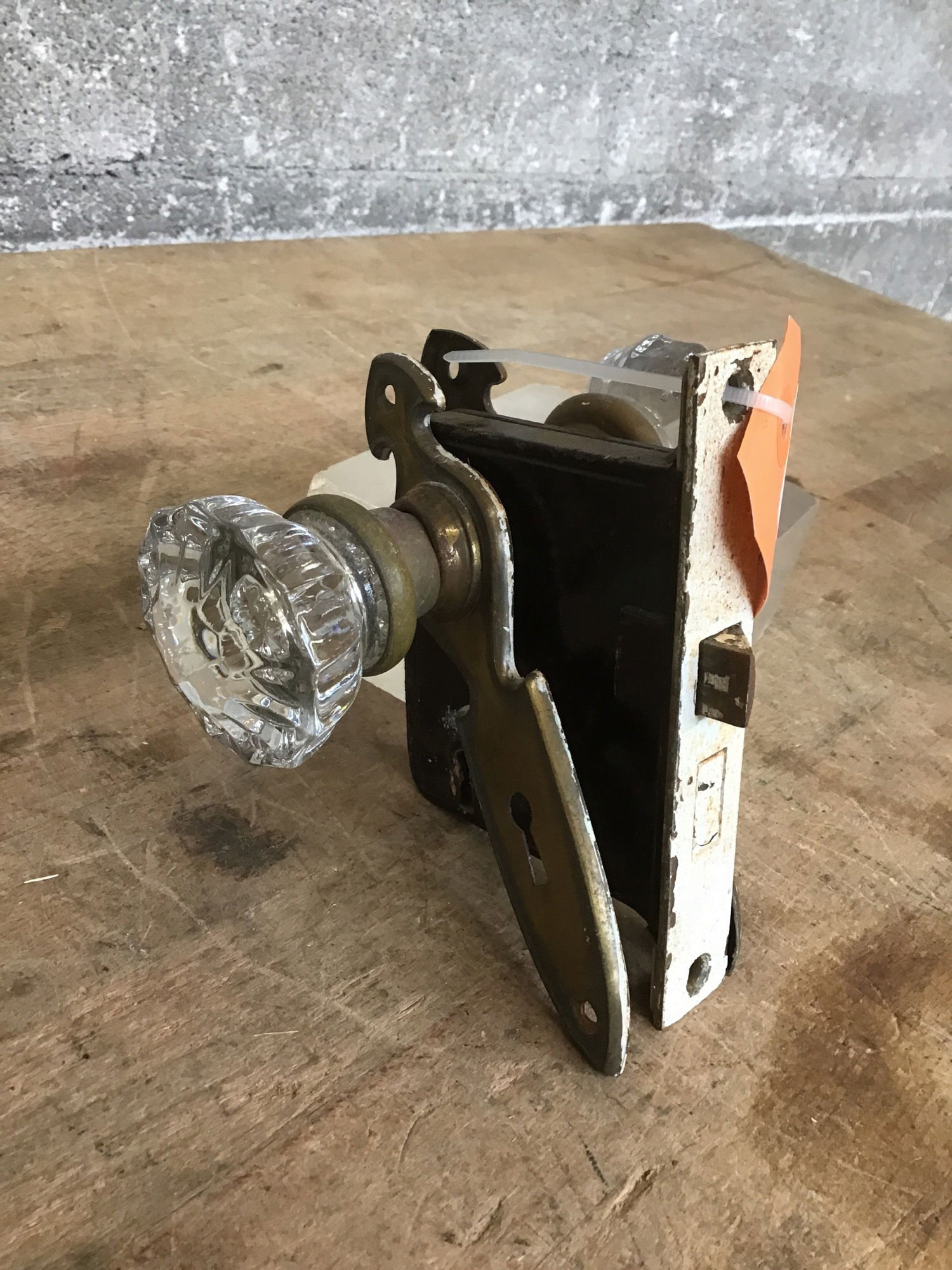 A full set for a vintage or antique door, with glass knobs, a spindle, aged brass escutcheons, and a classic mortise box.