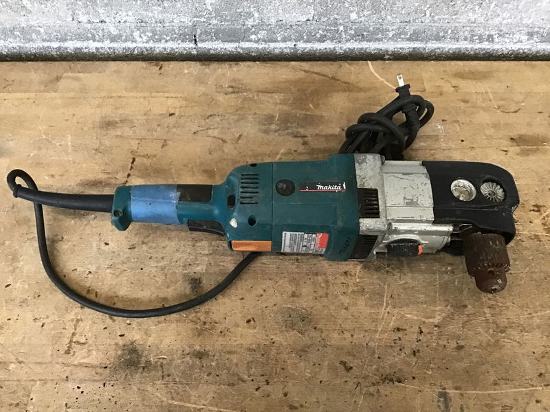 Makita DA4031 right angle 1/2 inch drill with two-speed heavy duty 10 amp motor. Motor runs fine. Unit does not include detachable handles or a chuck key.