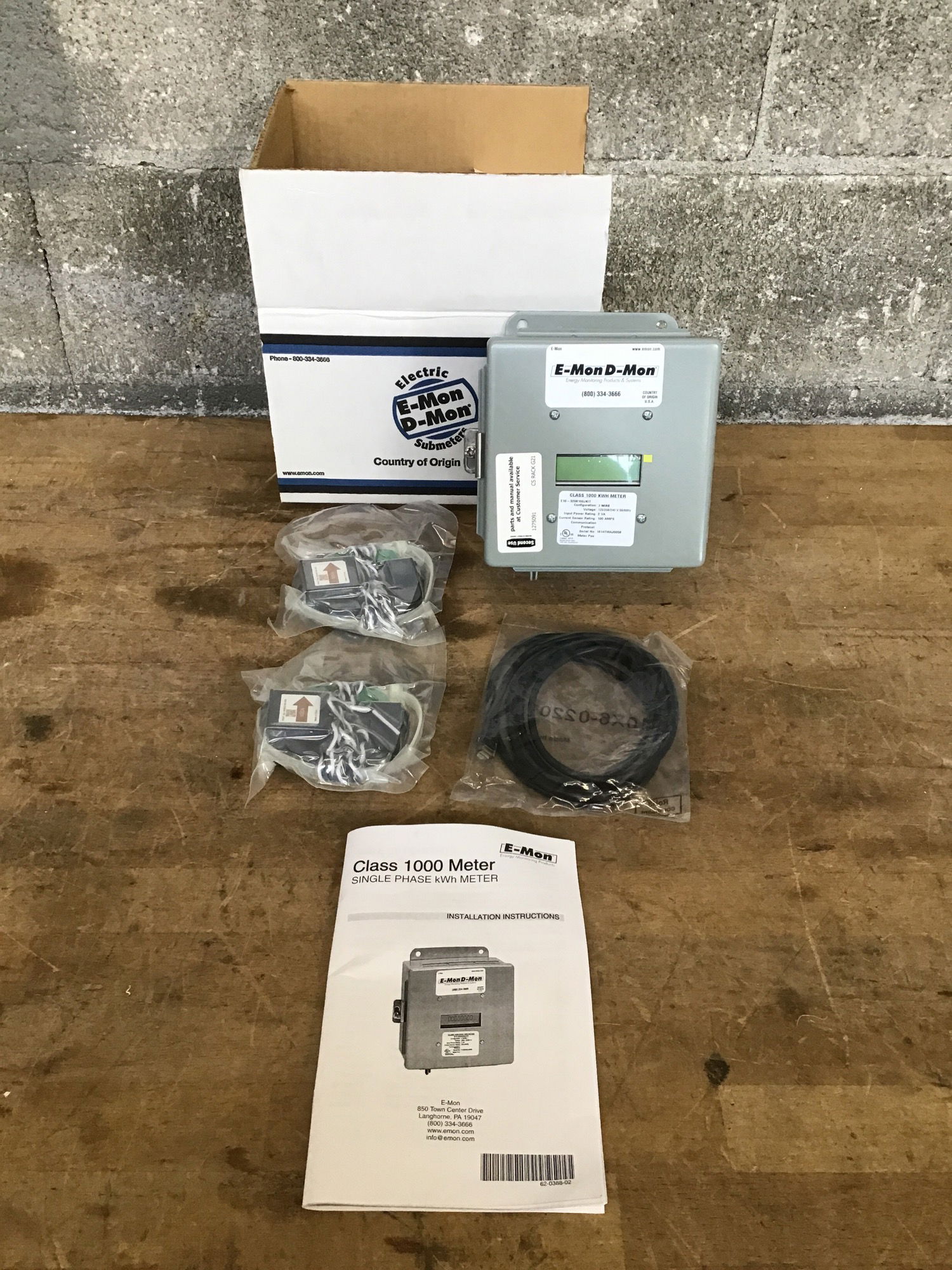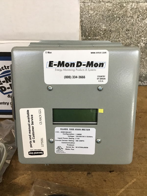 E-Mon E10-3208100-J-KIT Class 1000 kWh Submeter, Single-Phase, 208V, 100A, JIC Steel Enclosure, Pulse Output, 2 Split-Core Current Sensors with 2V Output New in it's original packing, never installed. Full product specs available here.
