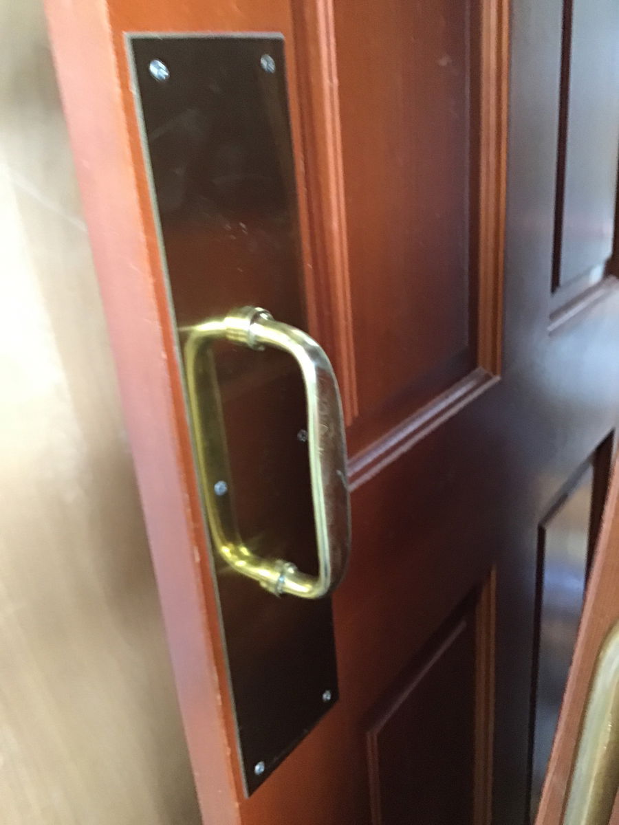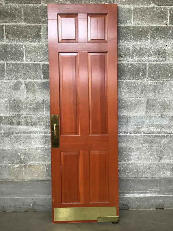 Stained fir, raised six panel door with a butler door hinge, push plates, pull handle and kick plate on both sides of the bottom. It's a nice door if you need something that swings both ways. Heck, the hardware is worth the price.