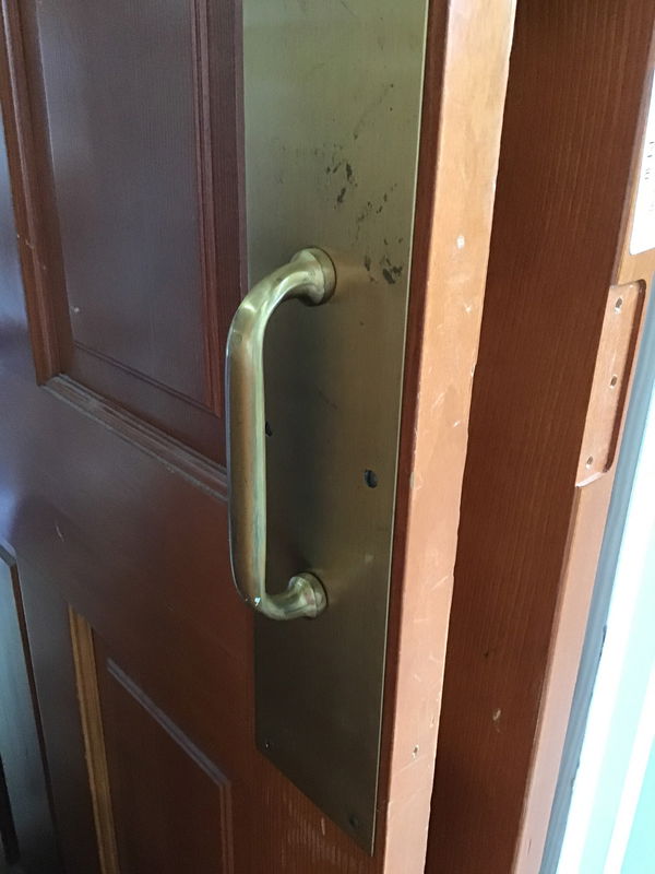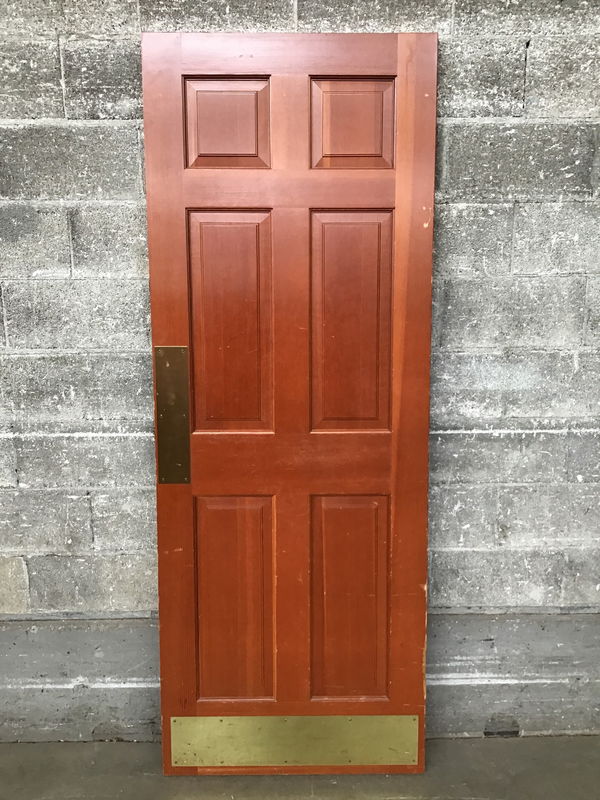 Stained fir raised six panel that has a pull handle on one side and push plate on the other. Price reflects the "extra hardware" and screw holes up top where a door closer once lived.