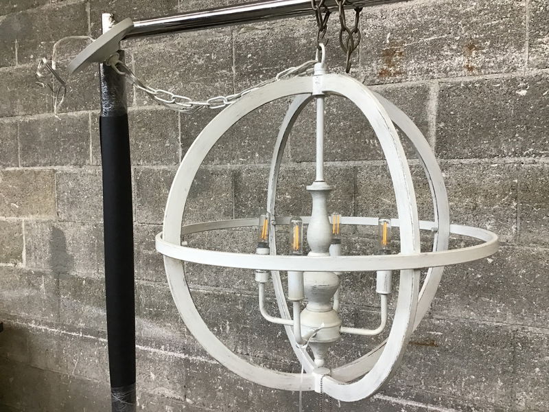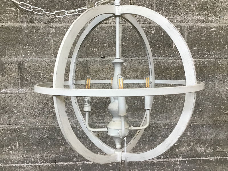 A whitewashed pendant featuring an Armillary-style cage around a four-bulb candelabra in the center. Manufactured by Signature Hardware for their Cardella line, this piece will bring a charming, rustic glow to your kitchen, foyer, or living room! Originally retailed new for about $350.
