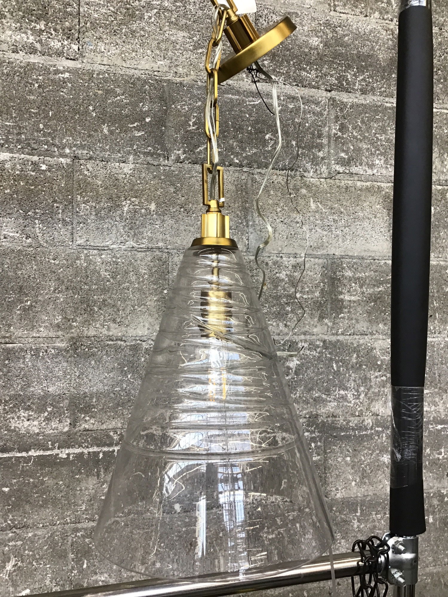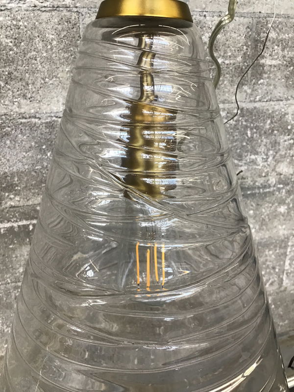 A classy and suave pendant fixture manufactured by Feiss as part of their Elmore line, this pendant features a brassy finish to its canopy and a rippled glass cone shade, an effect they achieved by wrapped small rods of molten glass around the cone. This unit retails new for about $360.