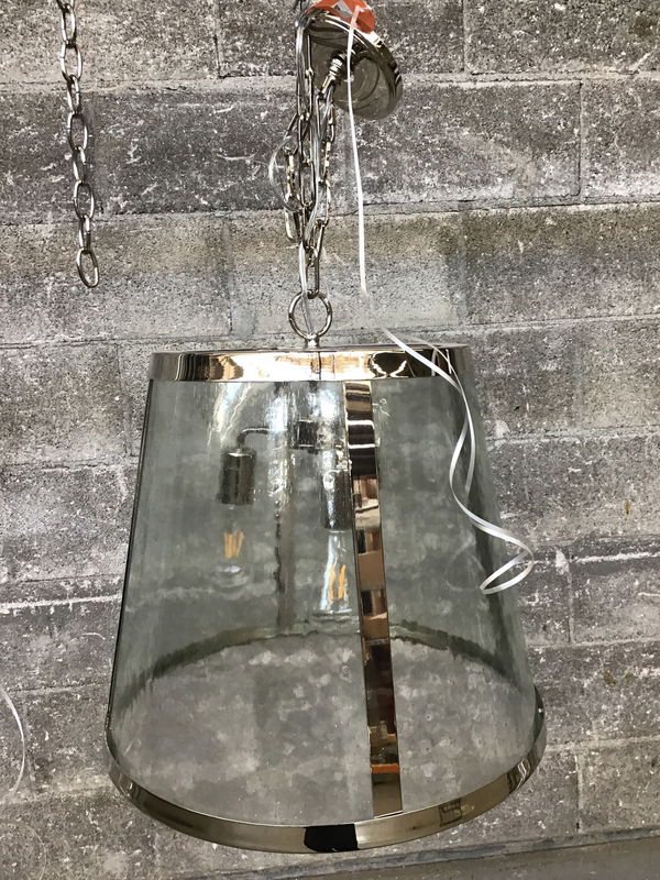 A pendant fixture featuring a drum-style shade that looks to take some inspiration from barrel construction, with four curved bubbly glass panes in the shade that nicely complement the polished nickel finish. Manufactured by Visual Comfort as part of their Harrow line and features three down-facing bulbs. Retails new for about $750.