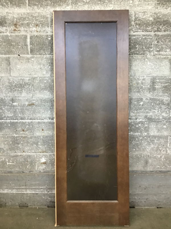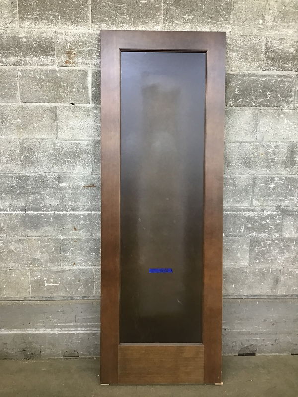 A full-lite door with beautiful CVG fir construction and a deep, dark stain to the wood. It's got protective film over the glass from the spray-staining process and it looks as if the prior owner was indecisive about what they wanted it to be- with hinge cuts on both sides (some of which were filled in) and a slightly incomplete stain finish that suggests it may have been planned as a pocket door. Price reflects the wonkiness of the finish and construction.
