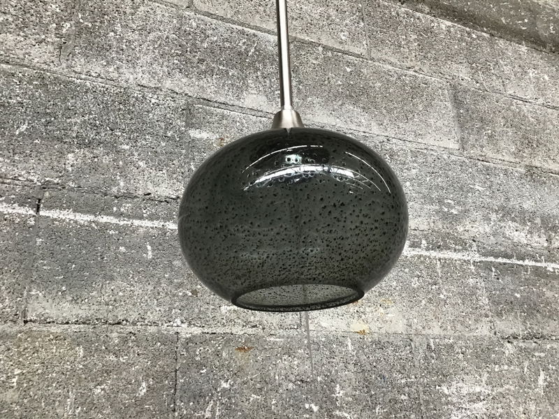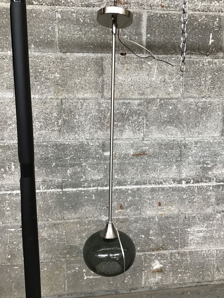 Pendant light with a textured, smoky glass shade and brushed nickel hardware. Wiring is good. Damp locations only.
