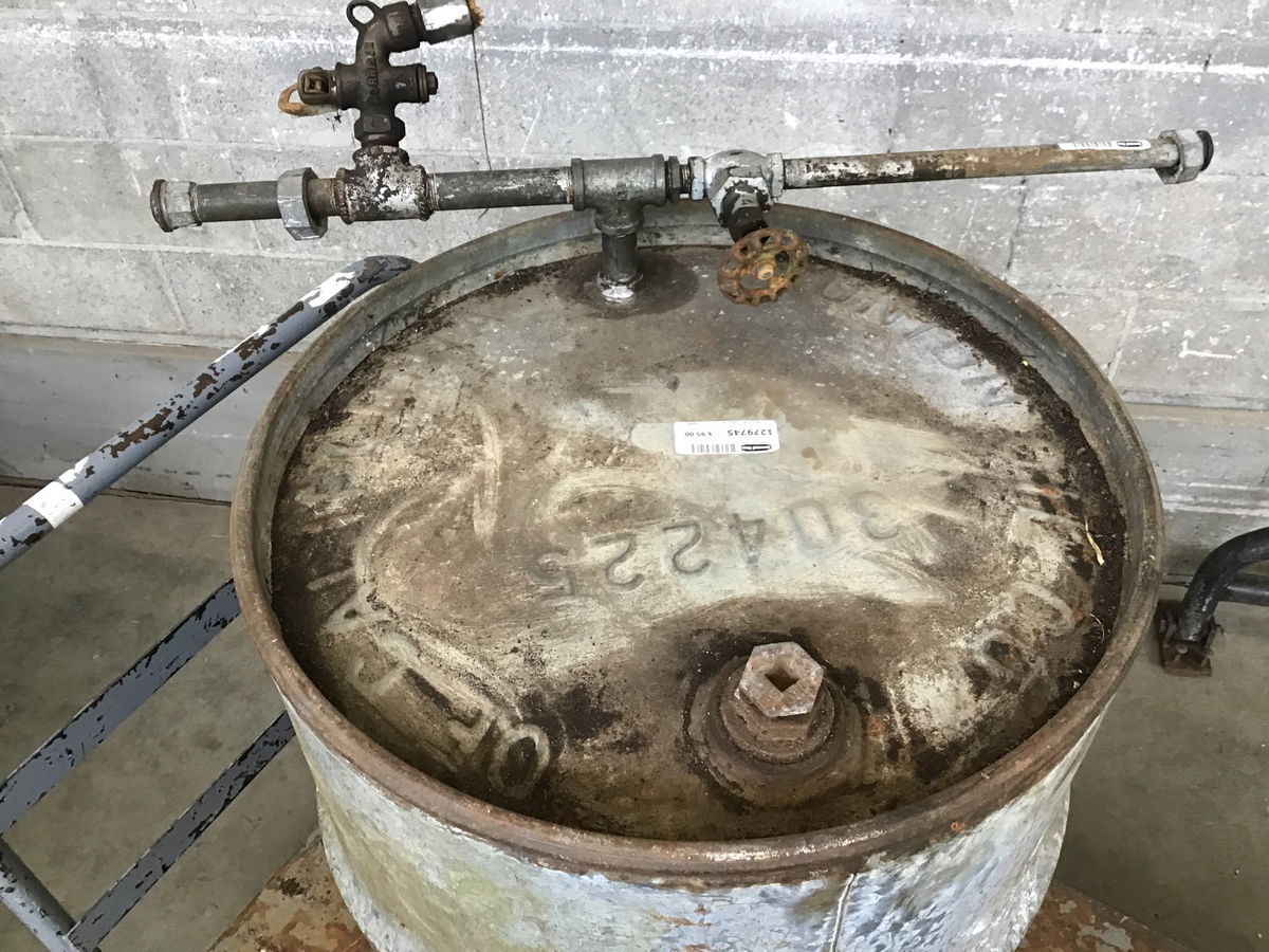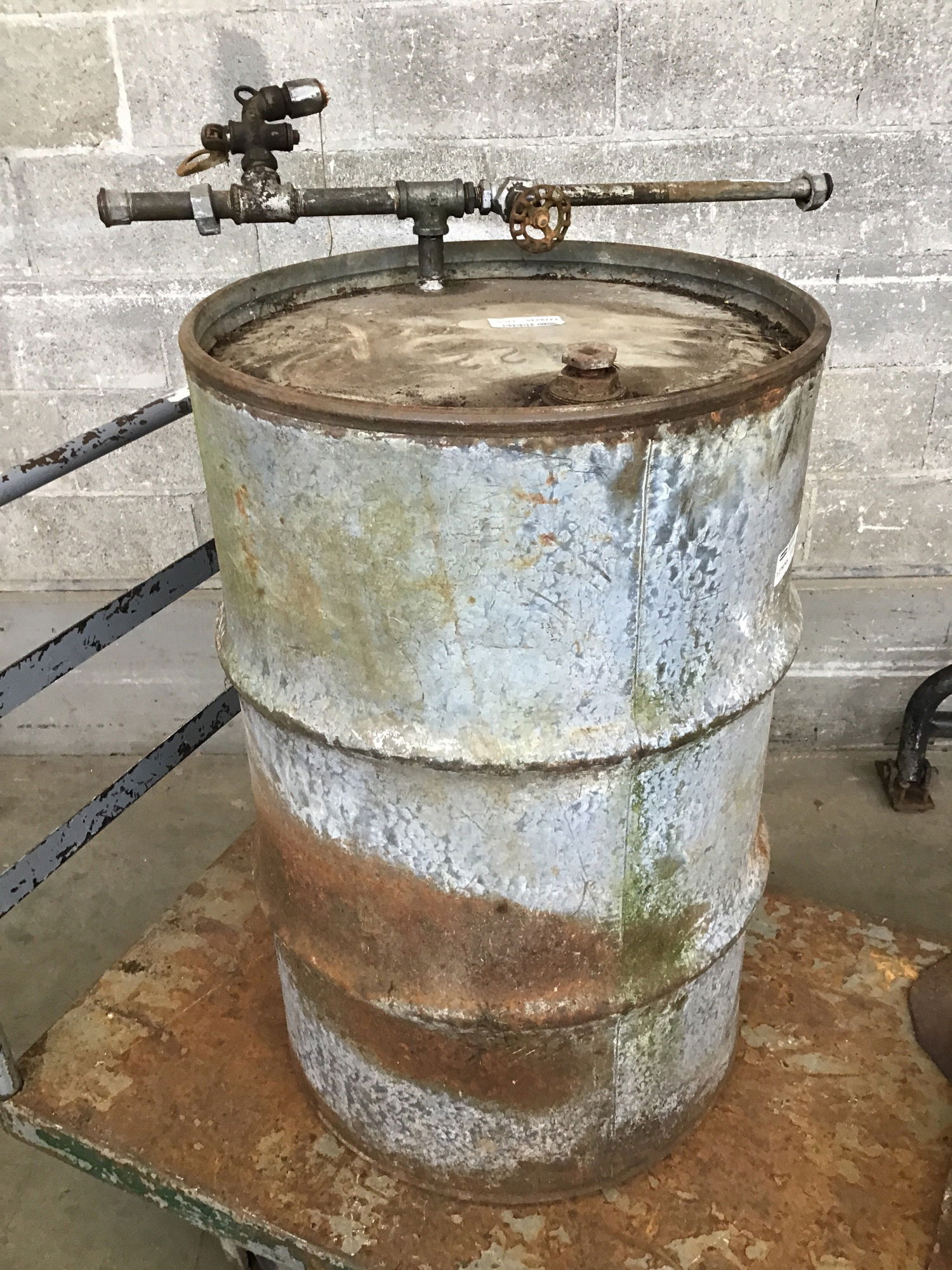 Vintage, heavy galvanized steel barrel marked "Union Oil Co. of California" on one face. There are some pipes and valves attached to the same face. Seems empty, but there might be a little residual in there.