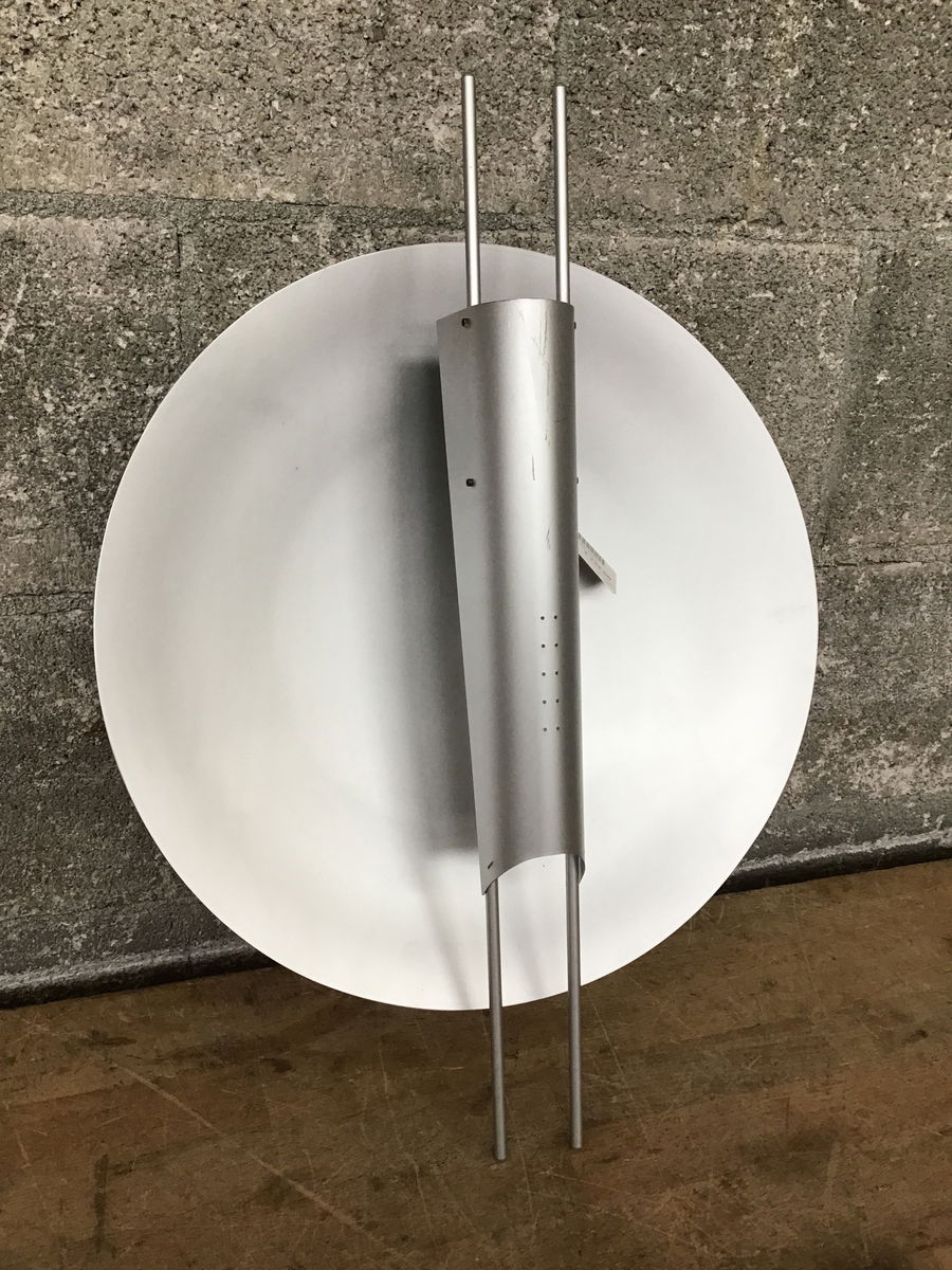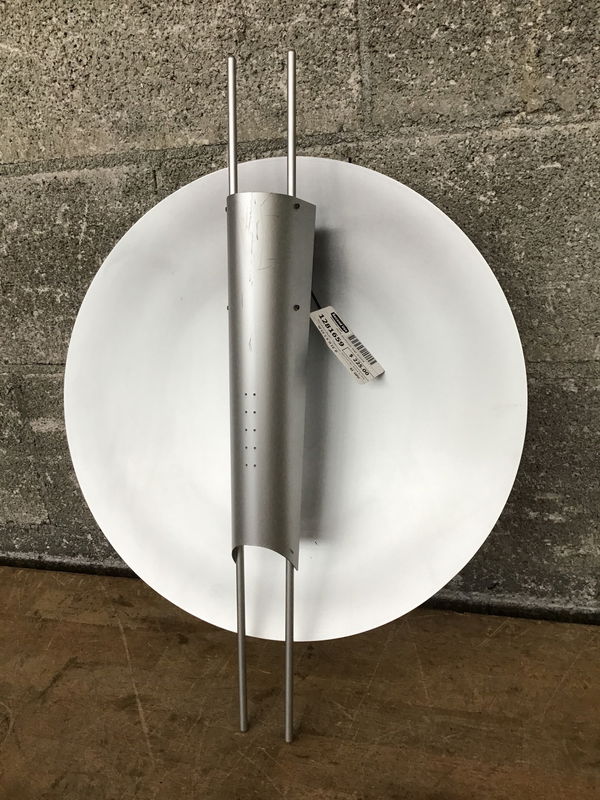 Mid-Century Modern "Copernicus" aluminum pan sconce by Piotr Sierakowski for Koch + Lowy, with a very space-agey look, a delicately perforated diffuser and a buttery brushed finish. Holds a four prong fluorescent bulb within its insect-like body. In excellent shape, save for a few scratches here and there. These things are quite hard to come by - see them going for $975 online.