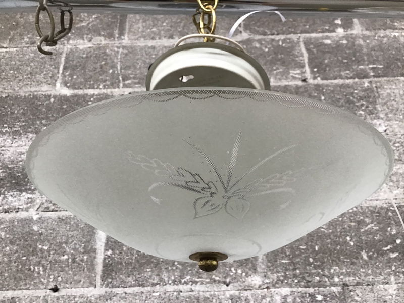 Midcentury "saucer" style light shade that has textured, white frosted glass with a flower pattern in the clear areas. Mounted on a newer three bulb fitter.