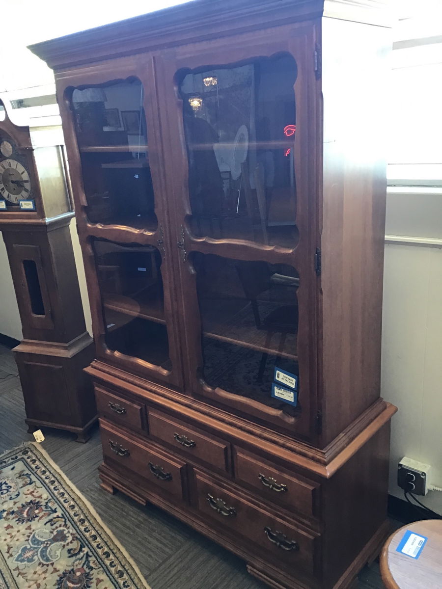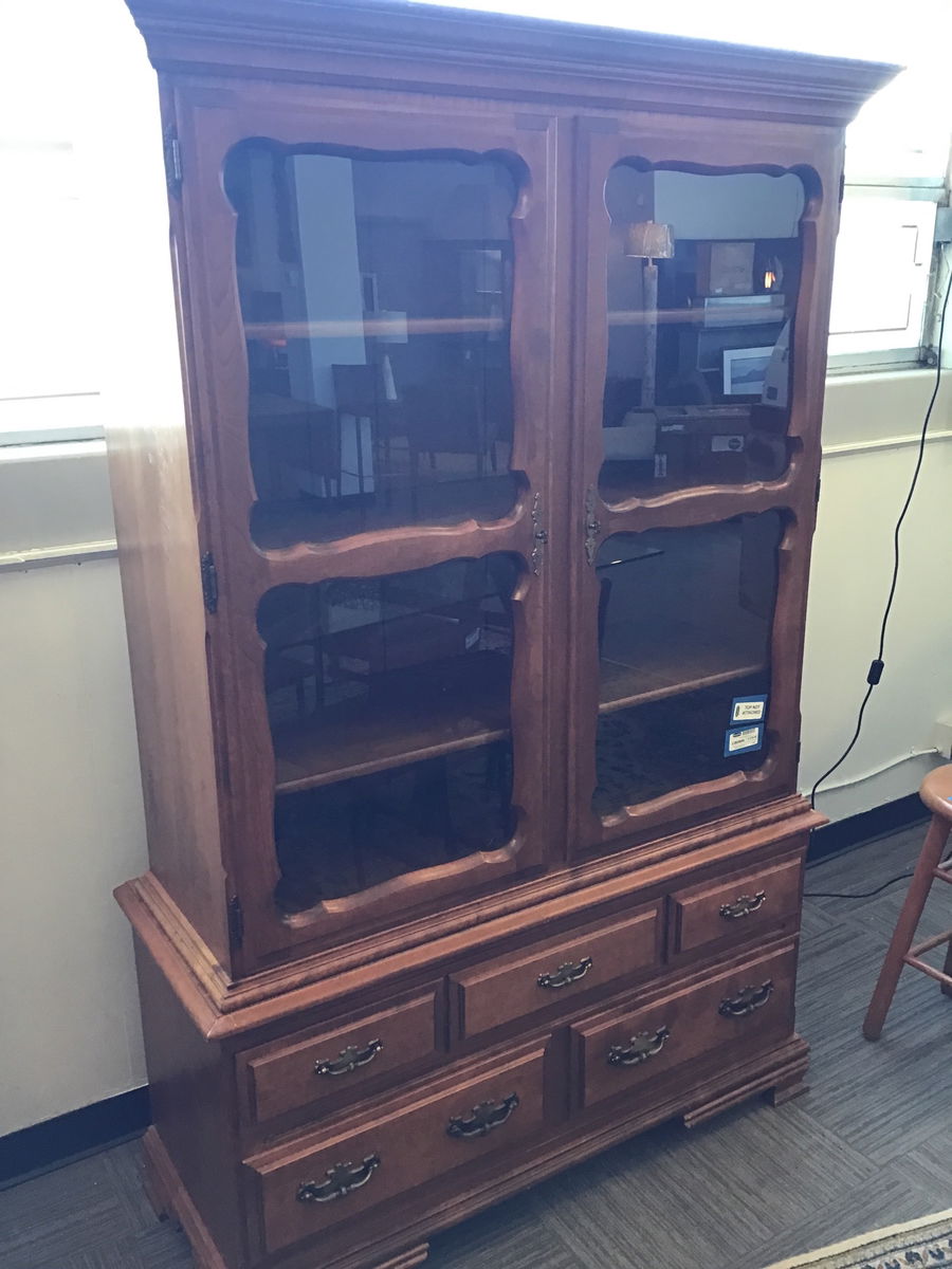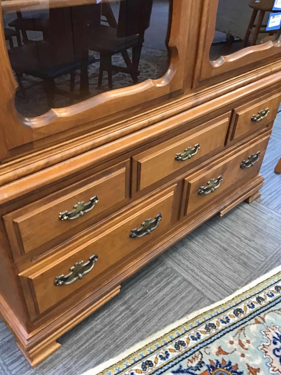 Beautiful two piece display hutch from Thomas Furniture Shops in California. Top is a lovely display cabinet with glass doors and 4 fixed shelves with brass key like knobs. Bottom is essentially a buffet with 5 drawers and brass pulls. Solid wood and with a nice light brown finish, this is a classic two piece hutch that comes apart for transport ease.