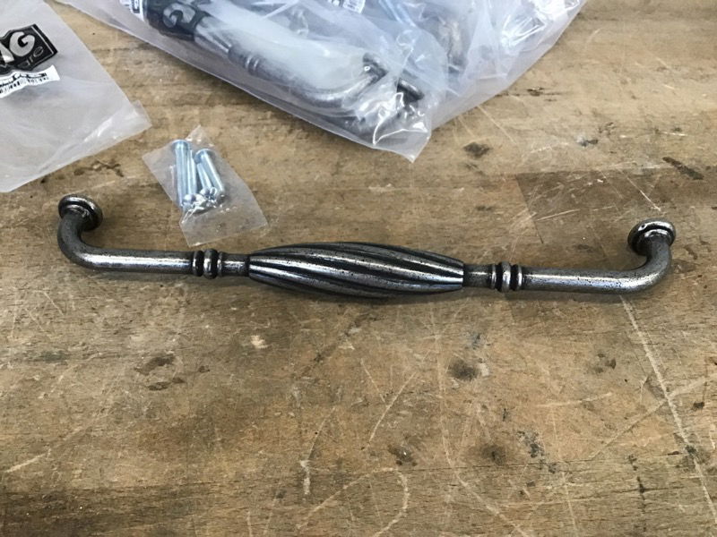 Set of 7 new MNG brand twisted drawer pulls with a distressed pewter finish. Mounting screws included. Photo may be representational.