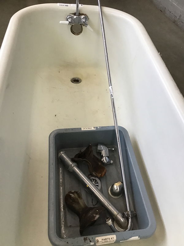 You're getting a little good with a little bad here. The tub has some worn glaze around the high traffic down spout area, but the rest is nice and glossy; original not refinished. There are a few small pock marks around the brim but no big gouges or sharp chips. The big issue is the two non-painted "back" feet are broken. The casing broke at the tub mount (included but a tough repair). Keep this a left hand tub, prop up the back on some bricks and send 'er bud!