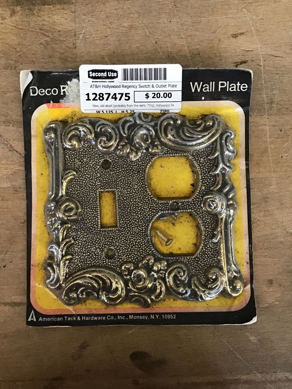 New, old stock (probably from the early '70's), Hollywood Regency style electrical wall plate for a light switch & duplex outlet. Made by American Tack & Hardware Co. Model 60 TD AB (antique brass finish). Packaging is frayed a bit, but plate has never been installed and screws are included.