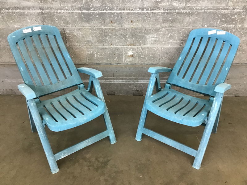 A pair of aquamarine IKEA folding patio chairs that look to be in good shape. The kind that summer nights were made for, all you need is a little fire pit!