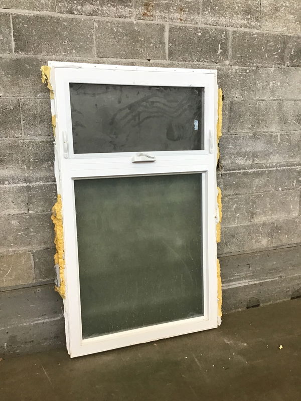 2019 Milgard double obscured window that features a fixed pane below an awning style opening window. One of the nailing fins didn't survive demo but the window itself is in good condition.