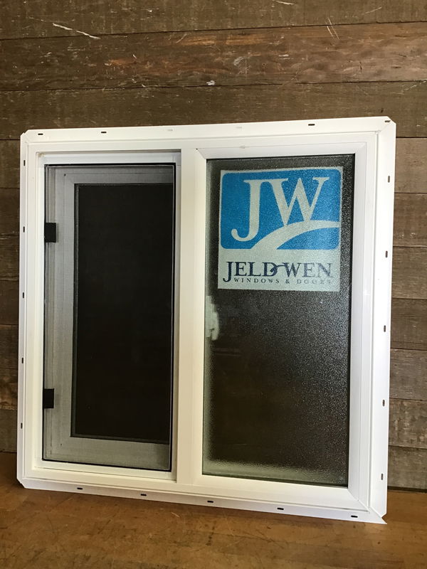 Brand new, never installed Jeld Wen vinyl slider. 2' x 2'. The window is a horizontal slider with obscured thermopane glass.