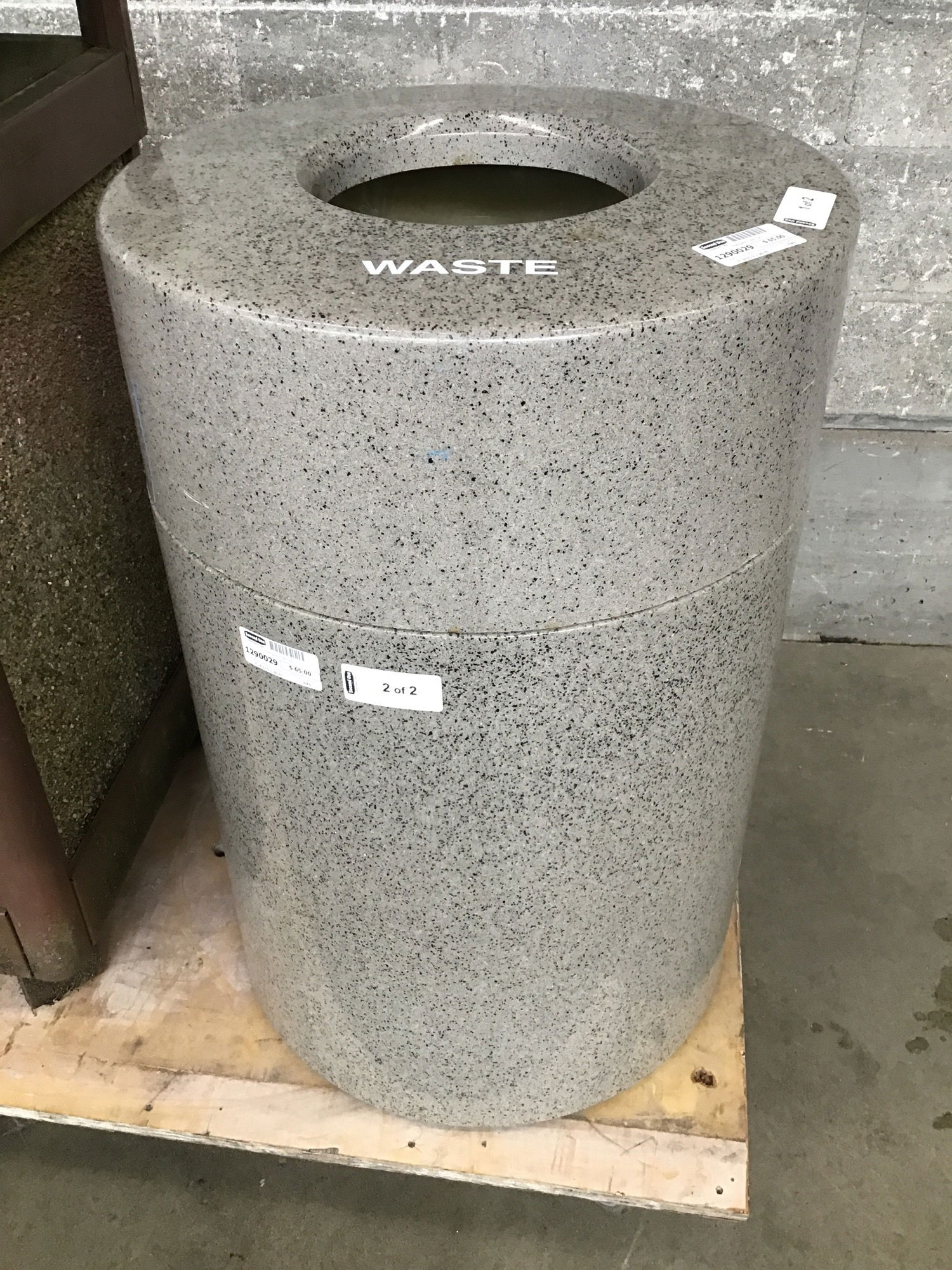 Newer and pretty sturdy commercial trash can with a pebbly stone-like surface.