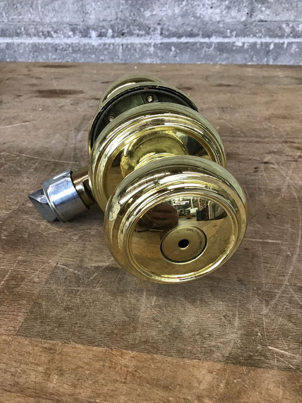 Pair of Baldwin heavy, solid brass door knobs with polished finish. This is a privacy set with lock. Item may have cosmetic damage.  Photo may be representational.