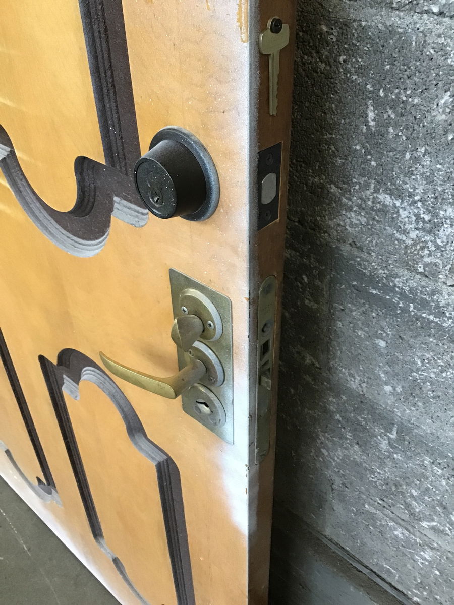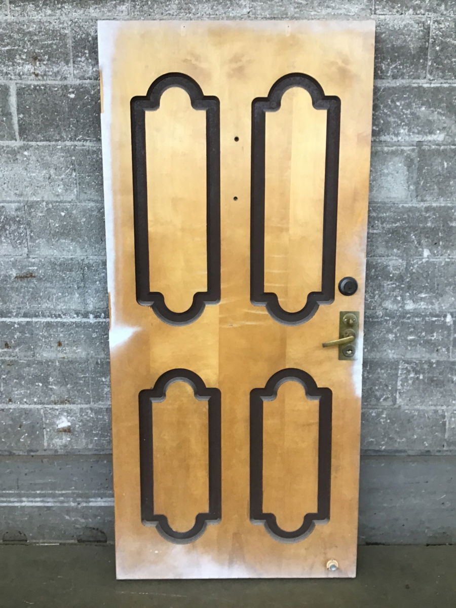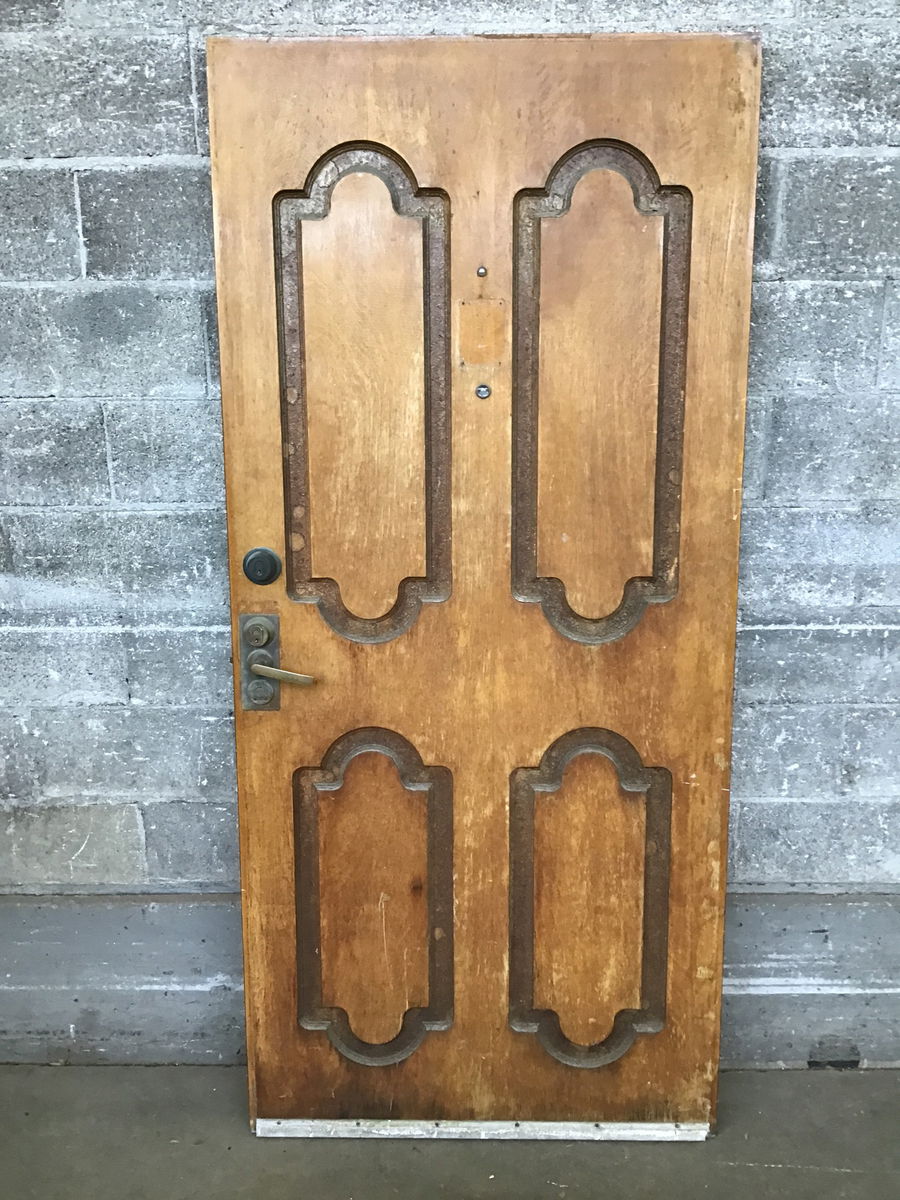 Old solid slab door with funky design routed into the particle board core, probably not great for full exterior exposure. Includes original hardware and a key for the deadbolt. I expect a fresh paint job would give this door some new life!!