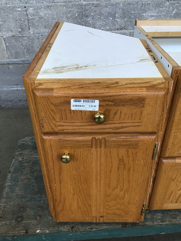 A base cabinet with an acutely angled backside, a drawer, and a little storage space behind the door. The corner face is on the left-hand side of the cabinet.