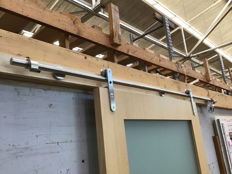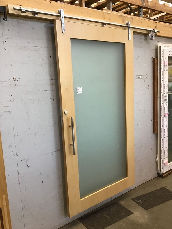 Very high quality White Oak barn door. Salvaged from a high end office space, would be perfect for residential as well. Has a frosted film on it but you could peal it off to have it be clear. The stainless steel hardware is excellent, the wheels have bearings that make the operation very smooth. Comes with stainless handles, track, mount pegs, and bottom guide that is recessed to be hidden. Has latch mortise installed but no keys, you could have the tumbler replaced if desired. This is a bulk item. No holds please. Photo may be representational.
