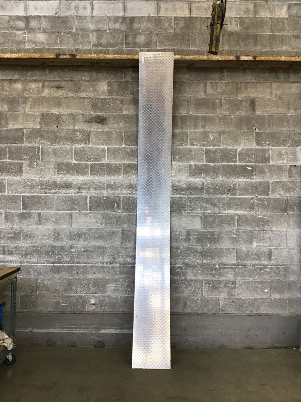 Not super thick, but thick enough (I measure 1/8" at flat point) to be substantial, diamond plate aluminum. Has quite a few rivet holes in it (& a few rivets yet), but they're laid out in straight lines and still a very usable piece.