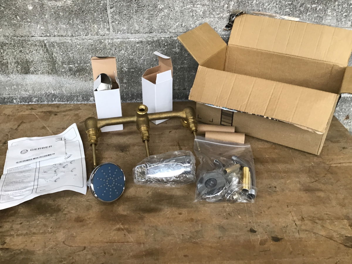 Gerber brass shower valve with what looks like a full compliment of chrome handles, escutcheons, shower spout, other parts and pieces. Cannot verify if it is complete.