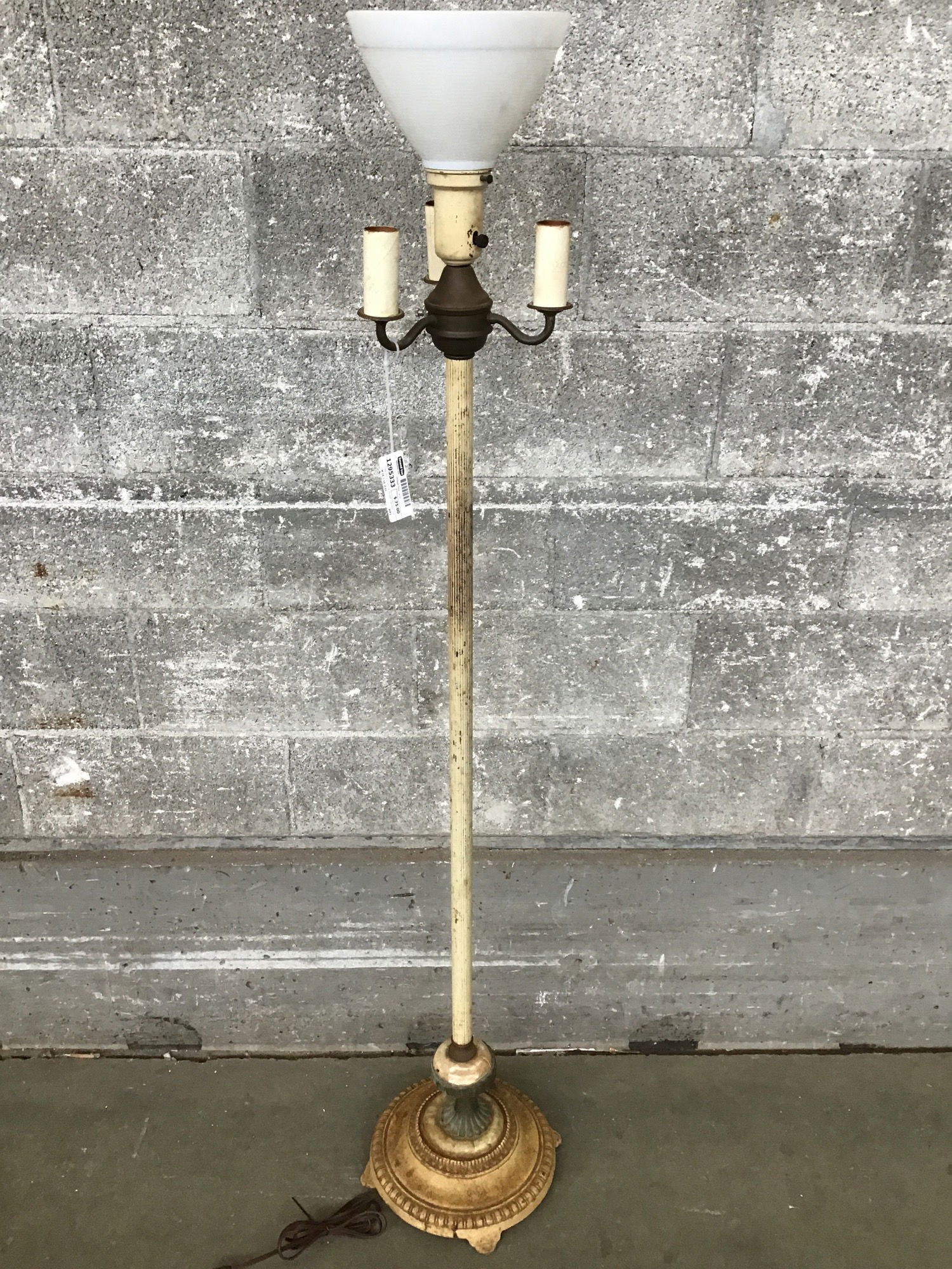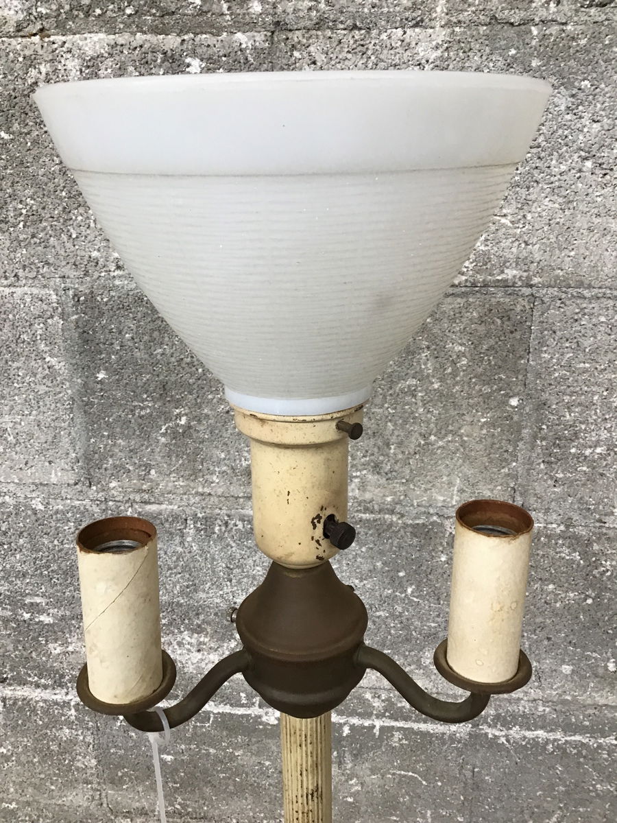 Vintage floor lamp with cast iron base, brass detail, original milk glass shade, and three candelabra style lights surrounding one central torchiere.