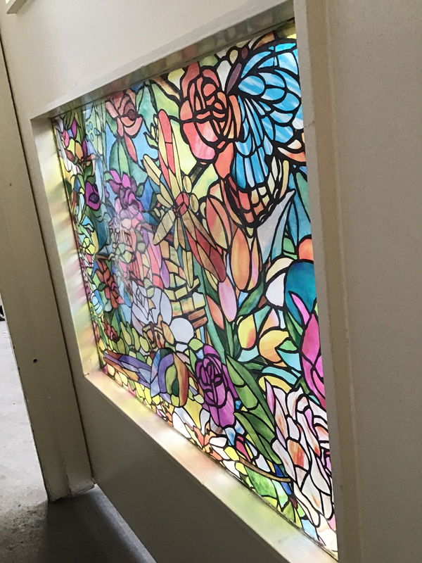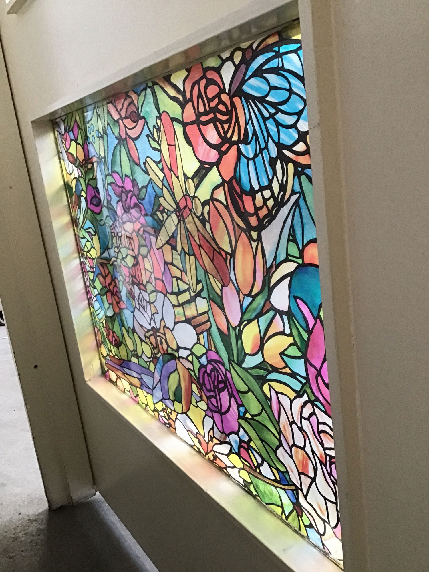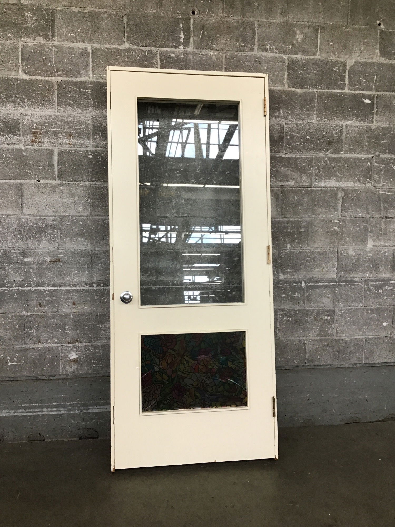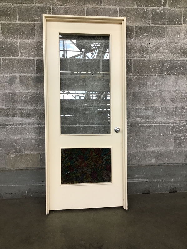 Solid fir overheight French door with two single pane lites, one of which is obscured with some flashy faux stained glass sticker. Exterior thickness; would be great as a mudroom-to-house door.