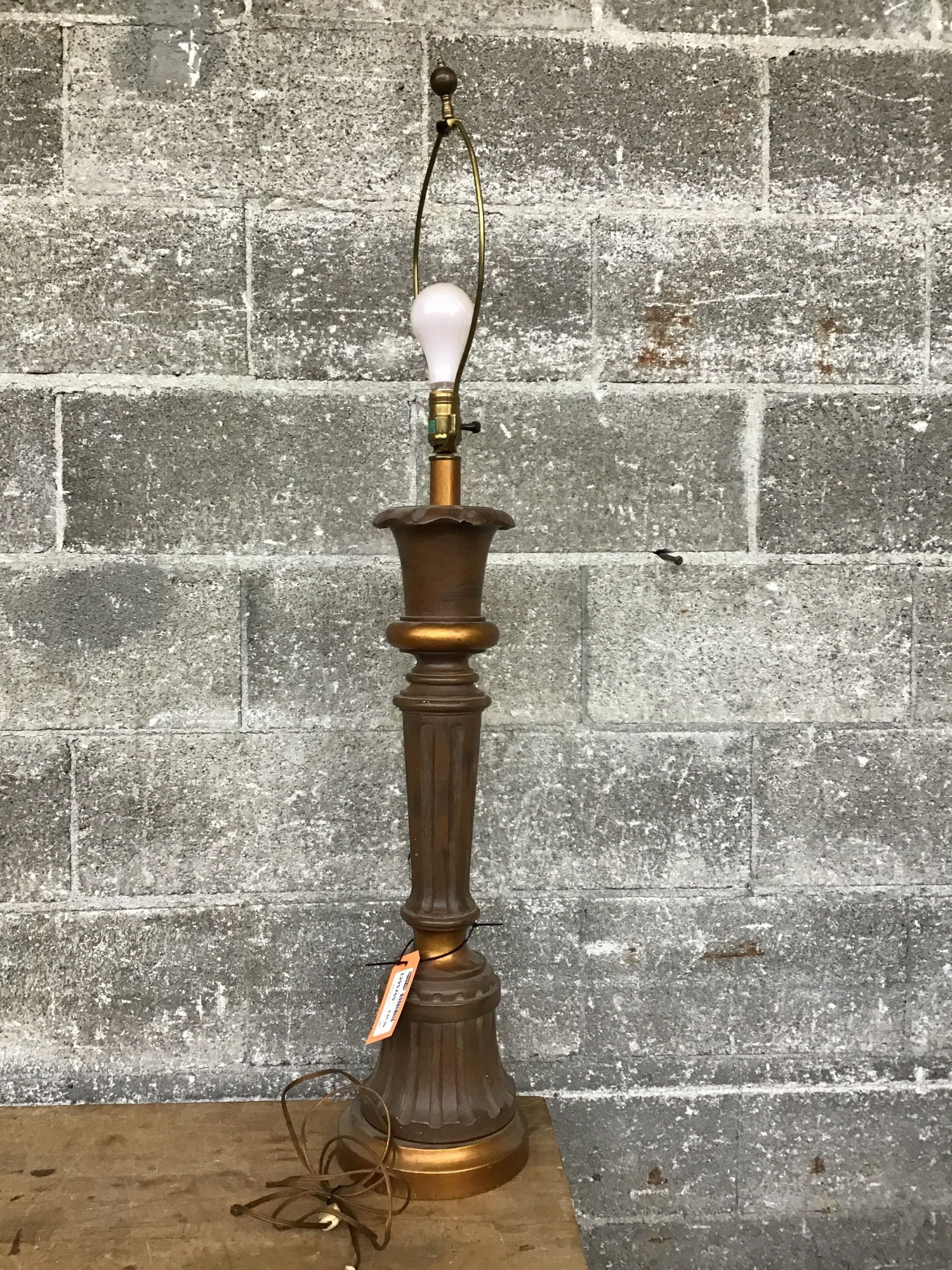 Nice table lamp with wood construction. Looks like they intended for a bronze look. Has 3 brightness settings. Does not come with a shade.