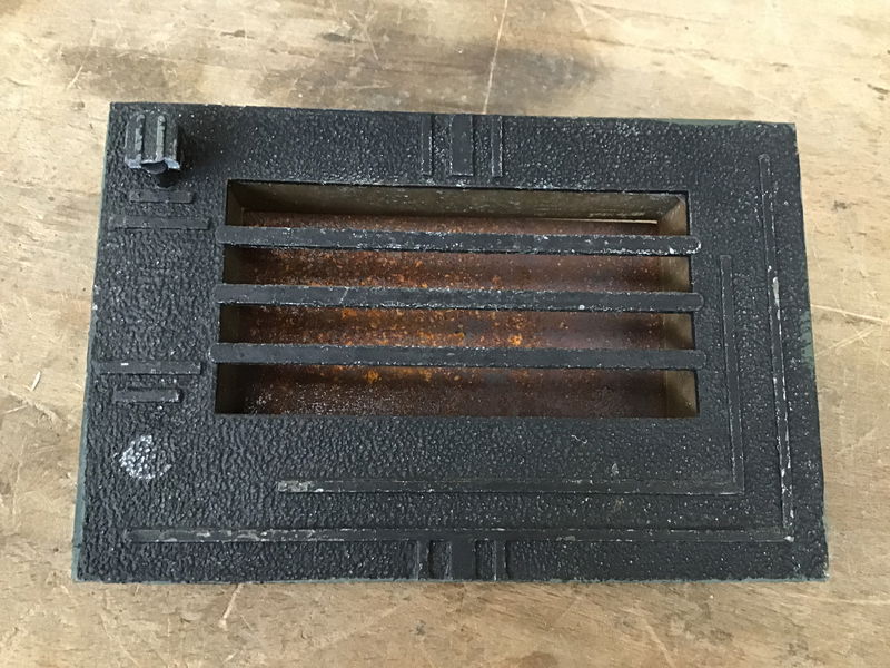 Vintage Peabody-Acker speakeasy with a decorative geometric exterior face and latch to keep the interior side closed. Seems to have a part missing, but doesn't affect function.