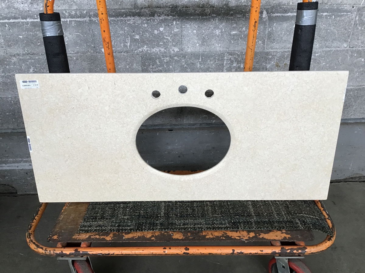 Here we have a stone bathroom vanity slab. It has a hole cut in for a drop in sink and holes for three faucet options.