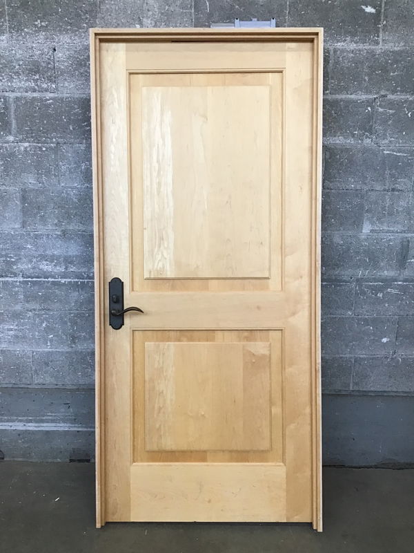 VERY HEAVY customized interior door in jamb that has above exterior thickness at 2.75" and is made of solid maple. Has raised paneling, and comes with beautiful distressed brass hardware and a lock (which will need re-keyed), and a custom catcher on it's top. Would make a great heavy duty shop or office door.