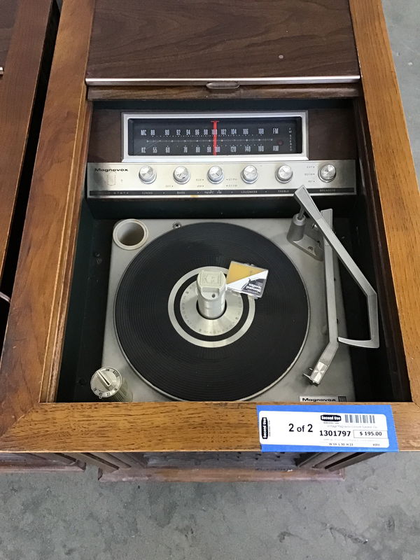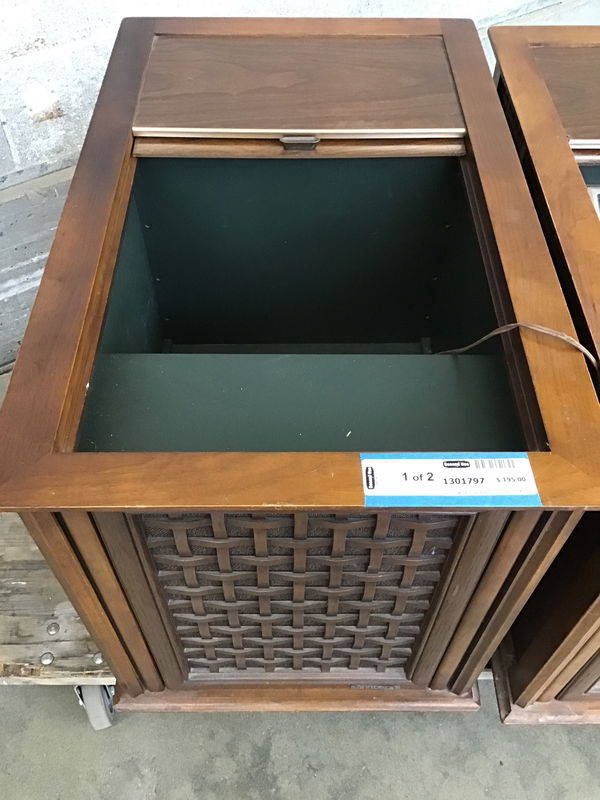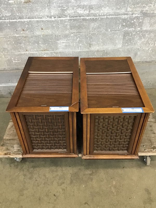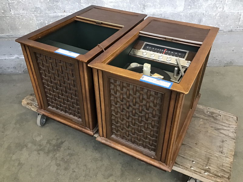 Sweet pair of mid-century Magnavox console speakers+built-in AM/FM radio and record player. The radio works well and the speakers sound pretty darn good. The record player needs service, we couldn't get it going. Sold as a pair and as-is.