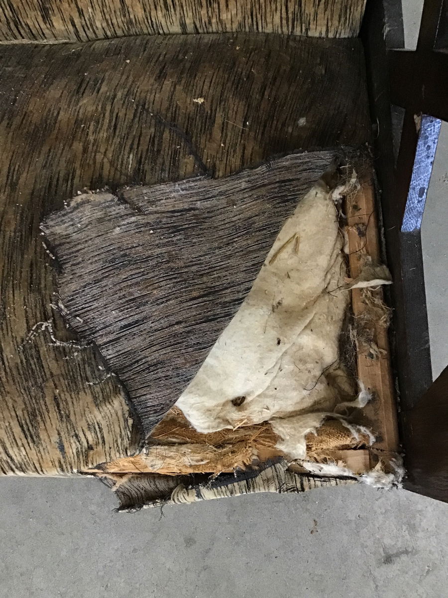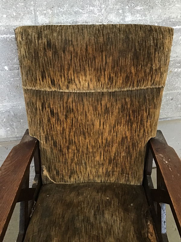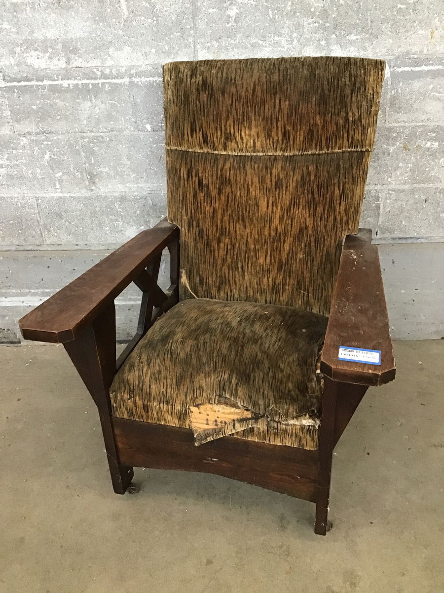 Morris brand antique recliner in desperate need of new upholstery, price reflects, it will be quite a project but the frame is in great shape and the reclining mechanism seems to work well. These chairs can be found online selling for $1000+ in good condition.