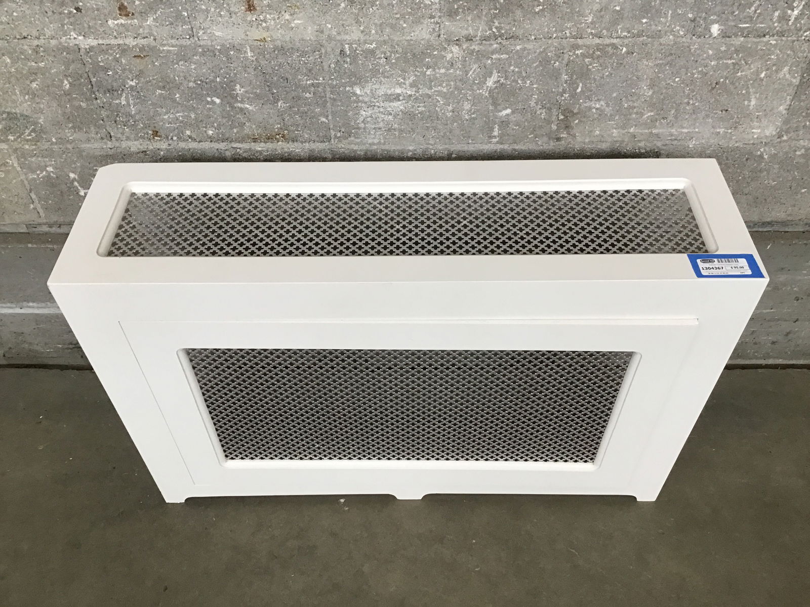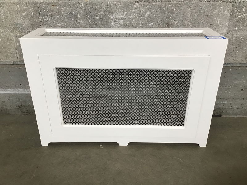 This Fichman Furniture 'Back Bay' radiator cover was custom ordered for its previous owner and features the 'Cloverleaf' screen. Don't have radiators? Use it as a plant stand! The front cover is hinged for access.
