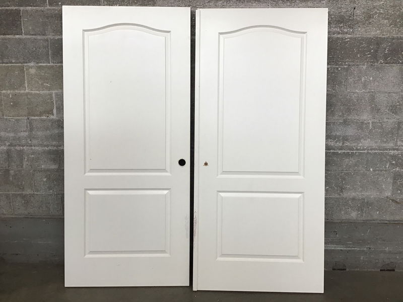 Pair of cathedral style, faux two raised panel solid core doors. Although these doors are exterior thickness, their masonite skin is not intended for the elements.