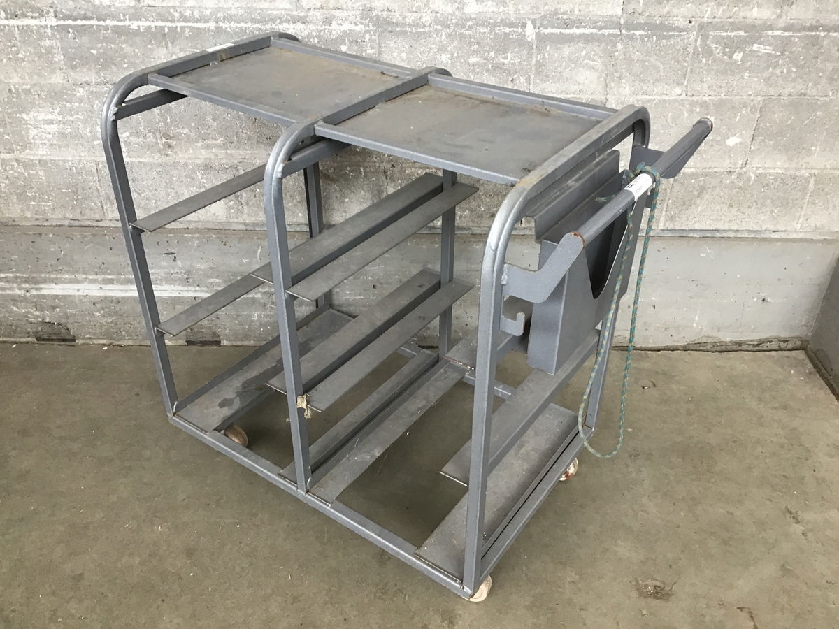 Metal Utility Cart that has hardware for flat storage. Rolls on four casters.
